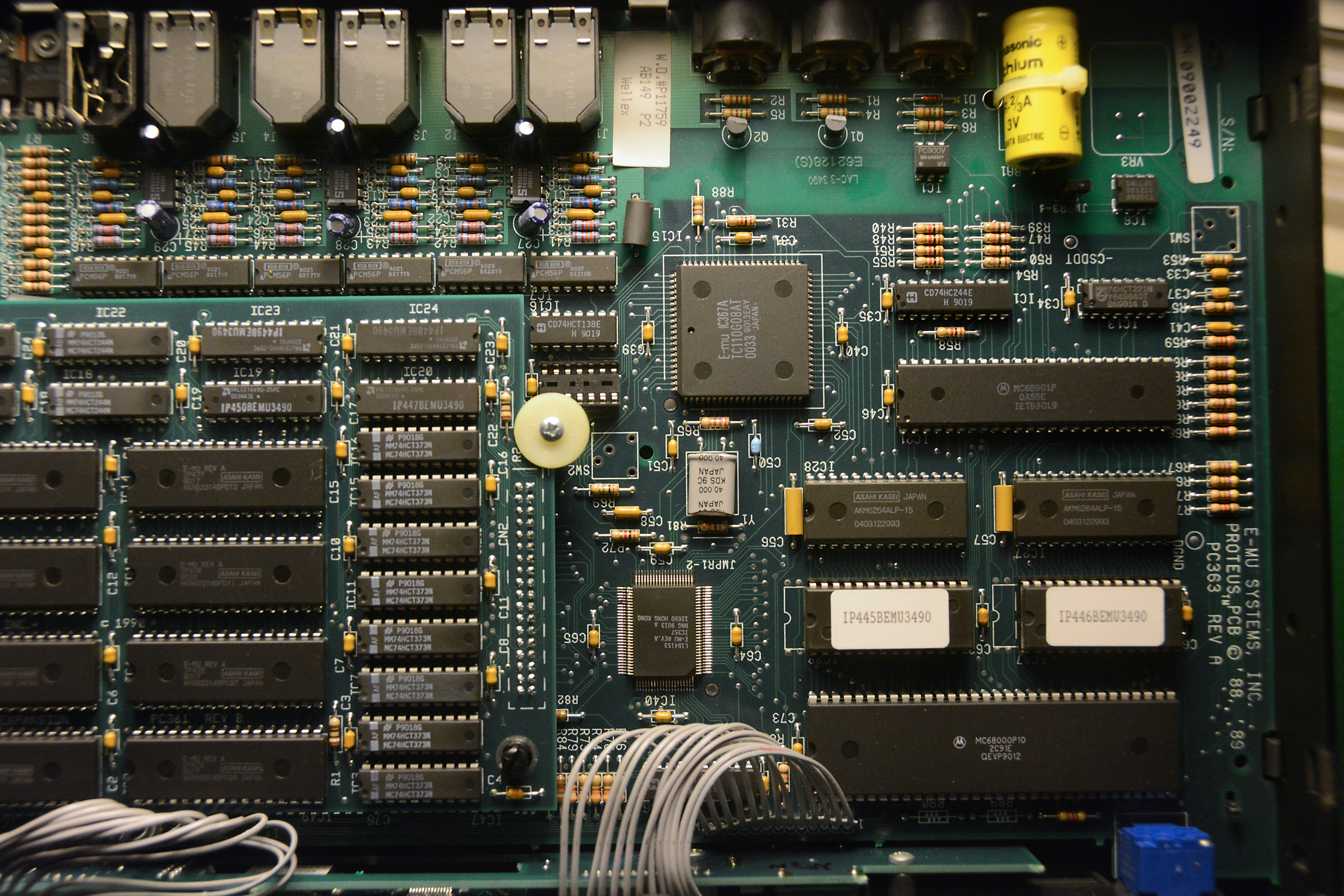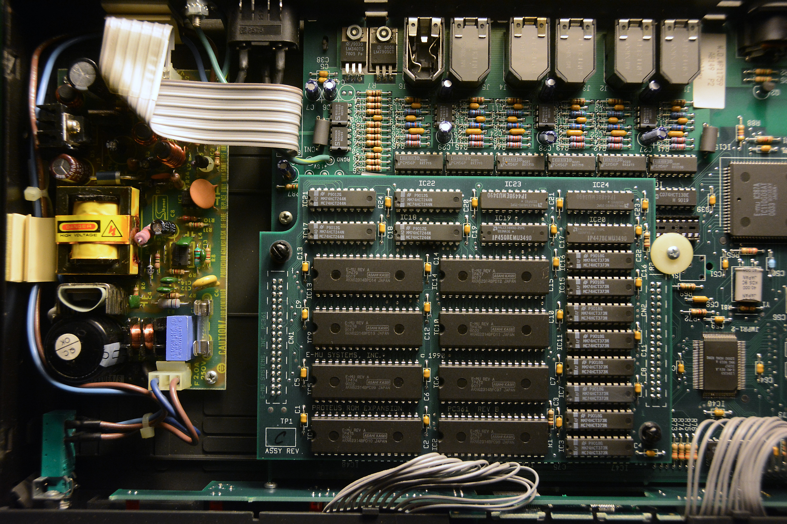 A stock Proteus/2 contains 8 megabytes of sound samples. As can be seen in the P2-1 picture, a second circuit board is present in the Proteus/2 unit. The additional 4 megabytes of ROM was needed to hold the orchestral sound samples of the Proteus/2.