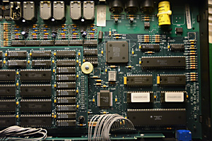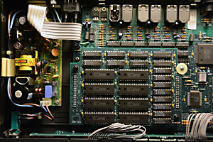 A stock Proteus/1 contains 4 megabytes of sound samples. The sound samples are contained in Read Only Memory (ROM). These ROMs are the large chips shown in the P1-1 picture. They are not removeable. If you look carefully, you will see two rows of holes on either side of this group of chips labeled CN2 and CN3. This is where a second circuit board, containing an additional 4 megabytes of sound ROM could be installed thus "expanding" the ROM memory to 8 megabytes. When expanded, the CN2 and CN3 connector holes are fitted with pins. The second circuit board, containing the additional sound ROMS, is stacked above the existing ROMs and plugs into the pins.