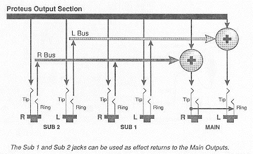 | Each of the Sub 1 and Sub 2 output jacks on the Proteus are stereo jacks. The Tip of each jack, accessed when a standard phone plug is inserted, connects to the left or right output of that group. If a stereo plug is inserted, the Ring of the stereo plug serves as a signal Return which sums into the main outputs. |